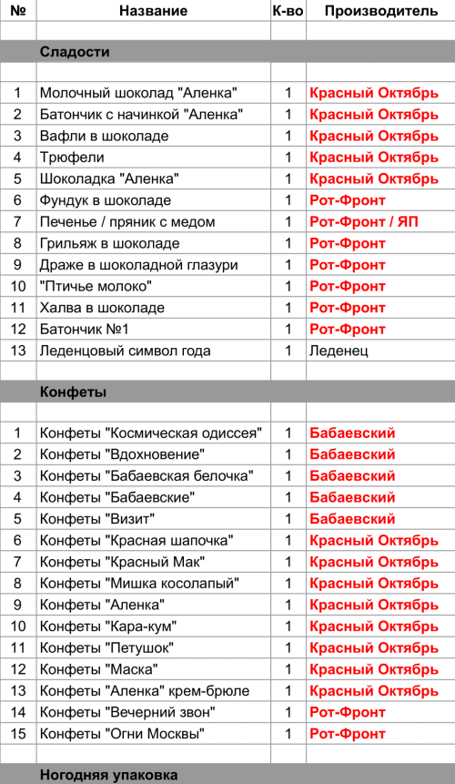 Молочный шоколад "Аленка" (1 шт), Батончик с начинкой "Аленка" (1 шт), Вафли в шоколаде (1 шт), Трюфели (1 шт), Шоколадка "Аленка" (1 шт), Конфеты "Красная шапочка" (1 шт), Конфеты "Красный Мак" (1 шт), Конфеты "Мишка косолапый" (1 шт), Конфеты "Аленка" (1 шт), Конфеты "Кара-кум" (1 шт), Конфеты "Петушок" (1 шт), Конфеты "Маска" (1 шт), Конфеты "Аленка" крем-брюле (1 шт)