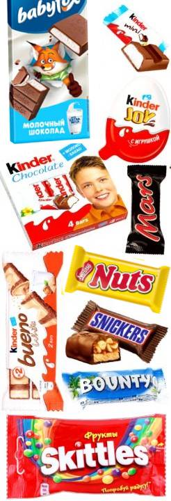 Киндер Джой (1 шт), Киндер Сюрприз (1 шт), Киндер Буэно Белый (1 шт), Киндер Делиз (1 шт), Киндер Буэно (1 шт), Киндер Кантри (со злаками) (1 шт), Киндер Макси (3 шт), Киндер Шоколад 4 плитки (1 шт),Киндер Бонс мини (5 шт), Киндер Шоколад мини (5 шт), Киндер Буэно мини (5 шт)